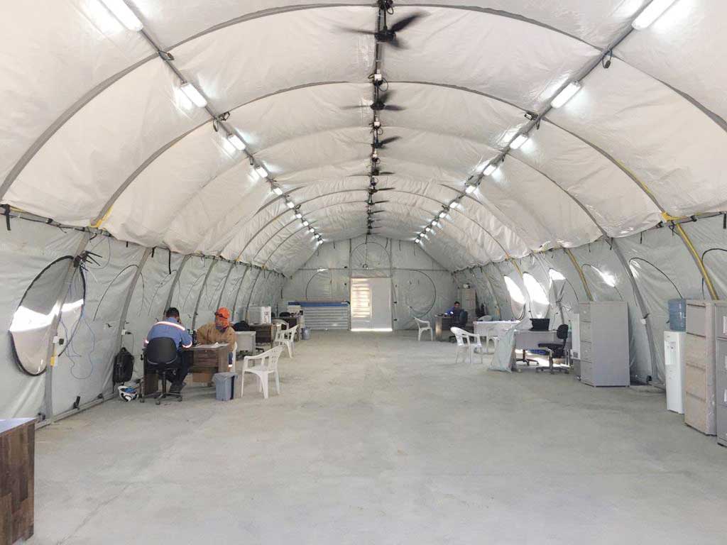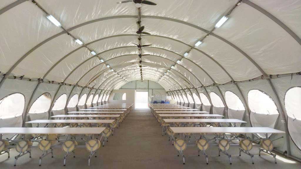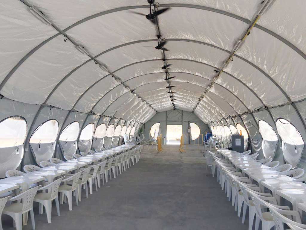 A Tenda Carpa para Refeitório tem espaço para o preparo seguro dos alimentos, além de estrutura para receber a equipe na hora das refeições.